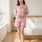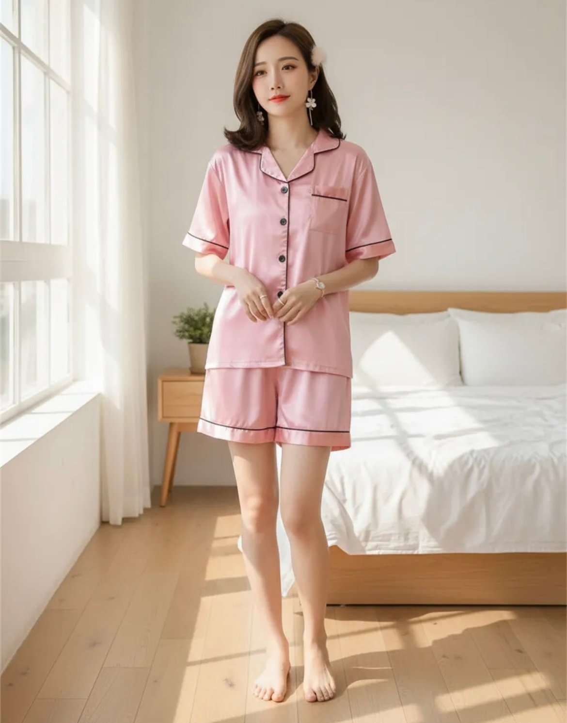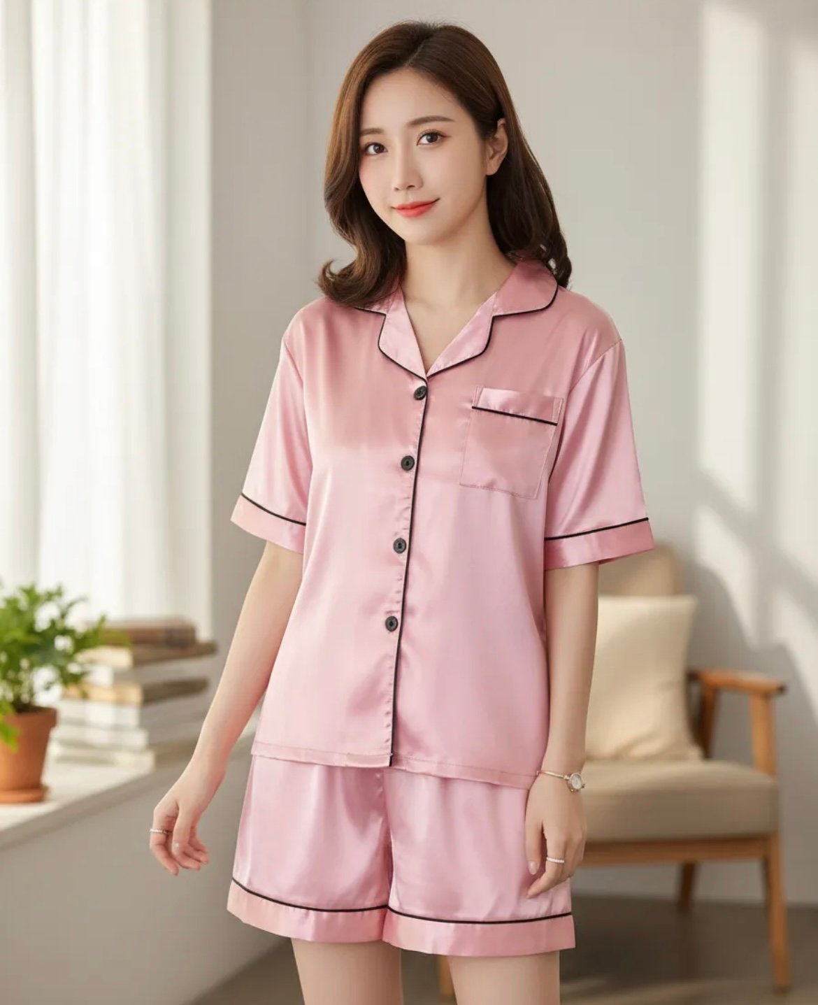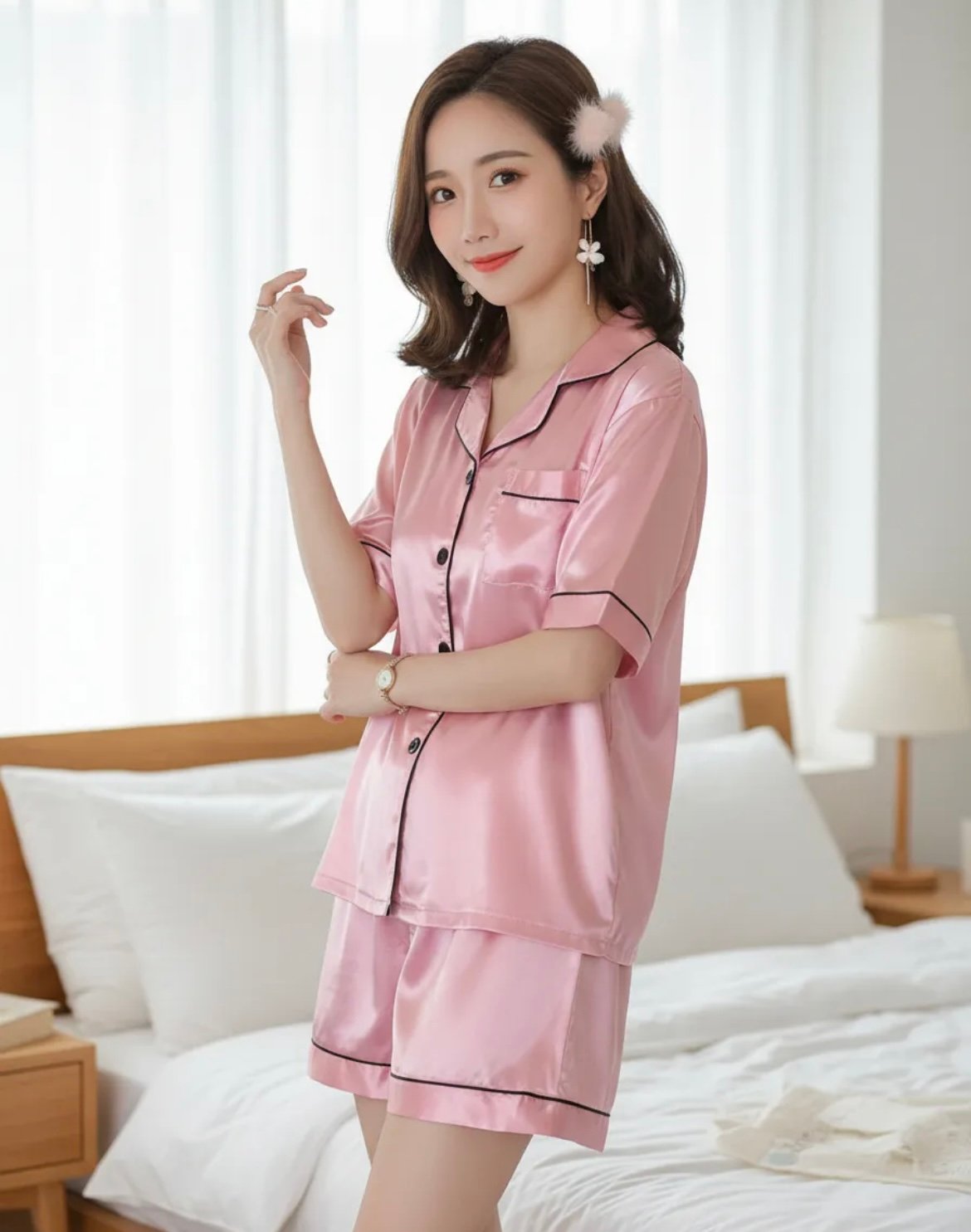 Disfruta de noches de lujo con nuestro pijama de satén con short y camisa de botones, diseñado para quienes aman la comodidad sin perder el estilo. Su tela suave y sedosa se desliza delicadamente sobre la piel, brindando una sensación fresca y ligera para un descanso placentero.